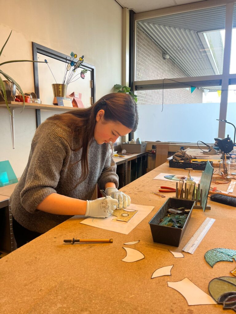 Dan beginnen we met alle kleuren erbij te zoeken, glas snijden en slijpen. Vervolgens gaan we rustig alles netjes omwikkelen met de koperfolie om het daarna zelf te solderen.