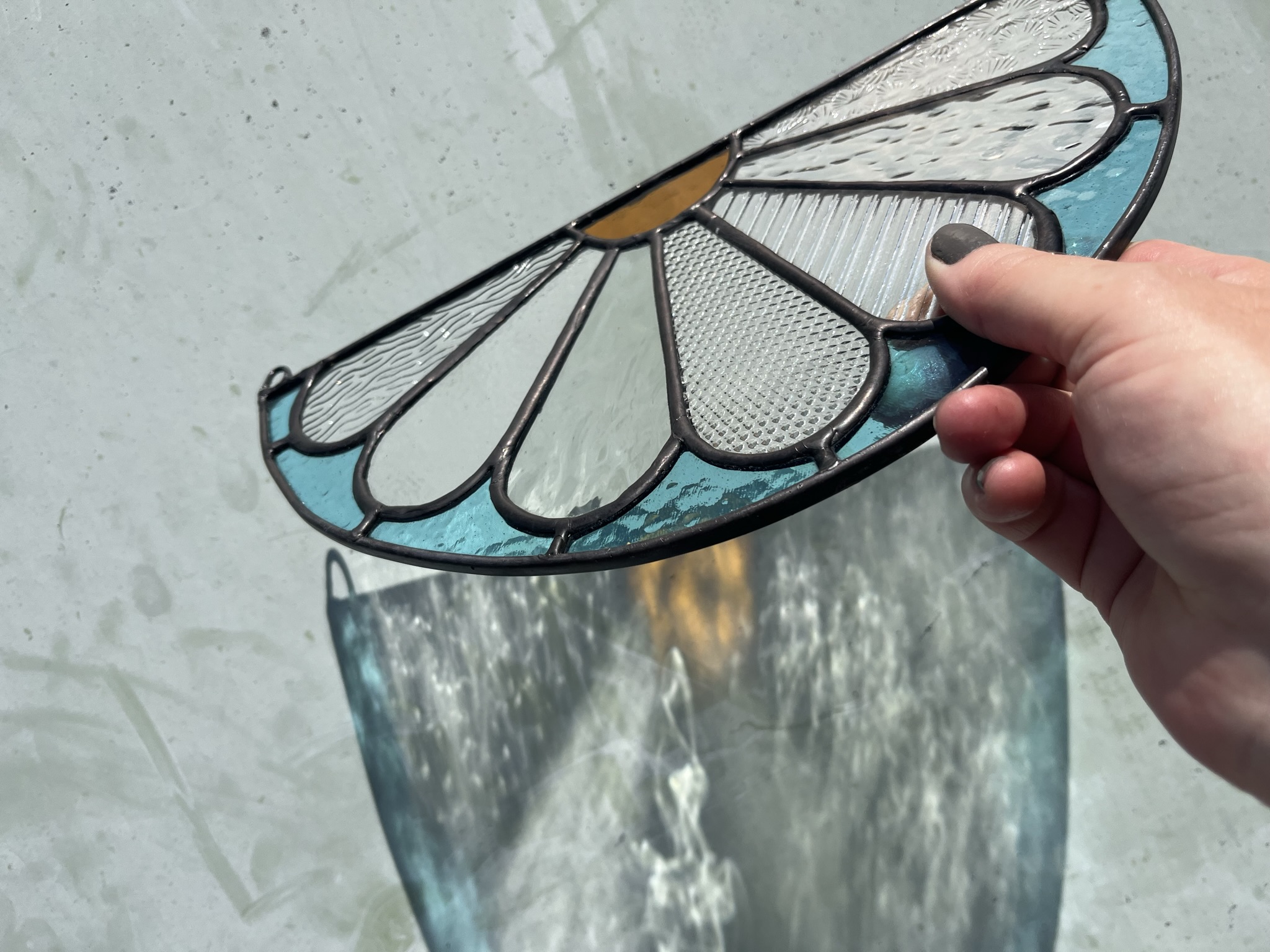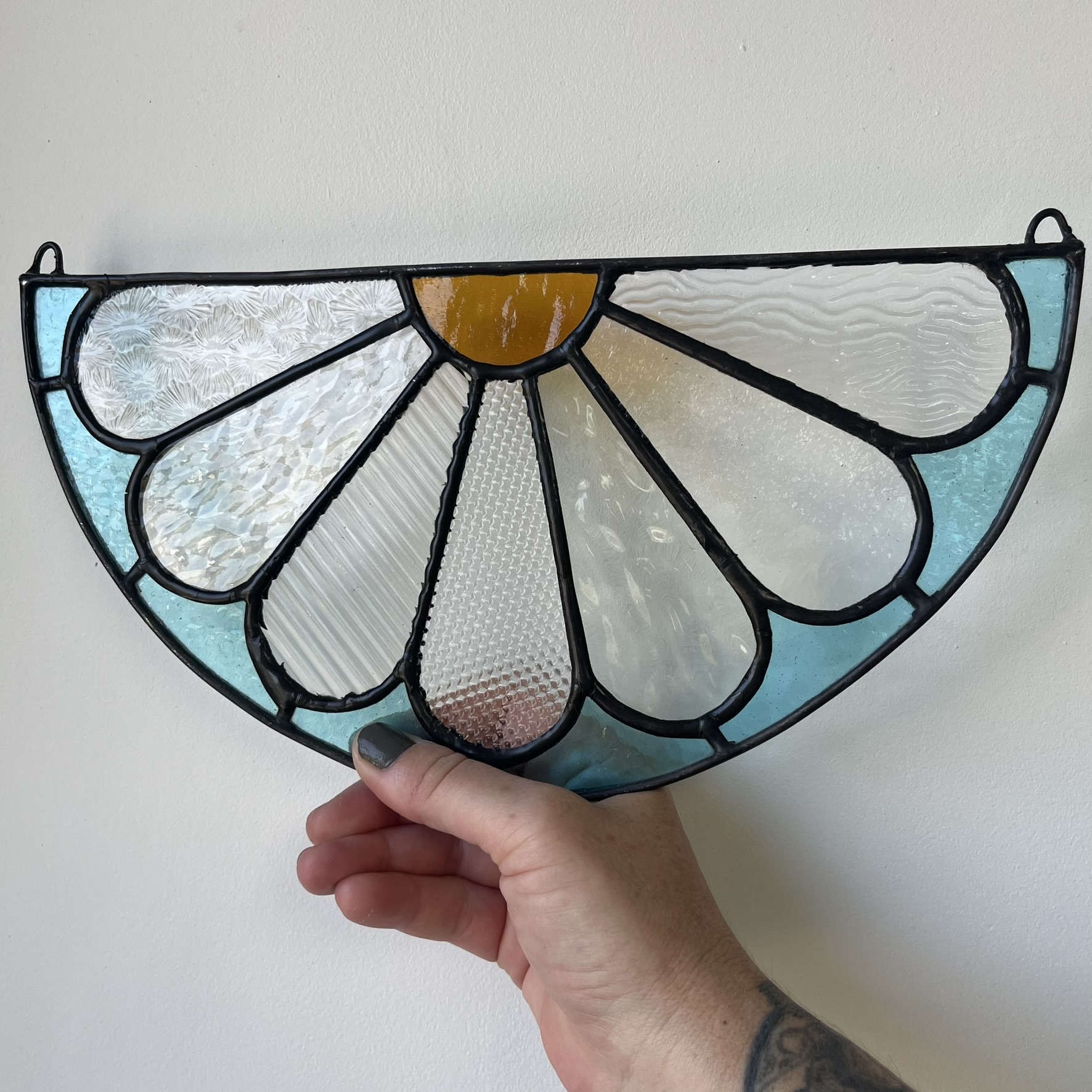 Deze Lazy Daisy is een vrolijk en luchtig glazen bloemraamstuk met een ontspannen uitstraling. De combinatie van helder, wit en zachtblauw glas laat het stuk prachtig oplichten in het daglicht. Door de halve, open vorm past hij mooi boven een raamrand, aan de muur of op een plek waar je een zacht en speels accent wilt.